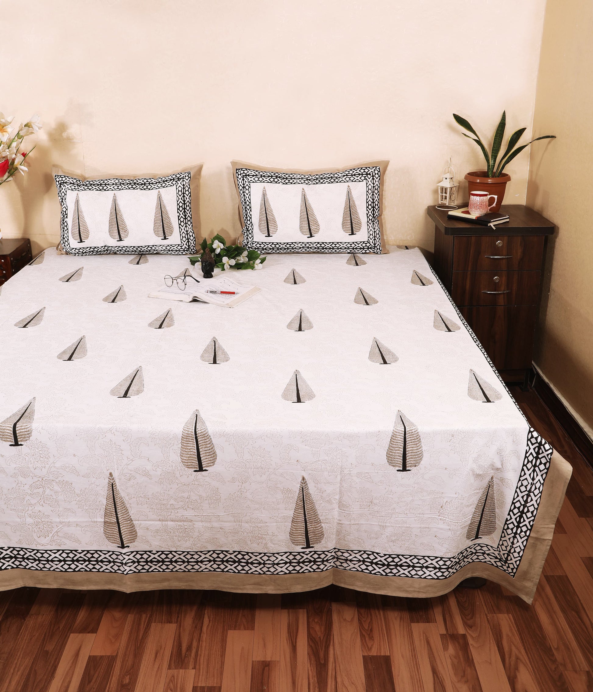 Step into regal elegance with the Sheesh Mahal / Golden Cypress Bedsheet from The Highmour Bloomline. Inspired by the shimmering beauty of the Sheesh Mahal (Palace of Mirrors) in Jaipur, this design combines heritage artistry with a modern golden touch. The hand-block printed motifs reflect intricate craftsmanship, while the soft tones and golden-inspired highlights bring a sophisticated charm to your bedroom.